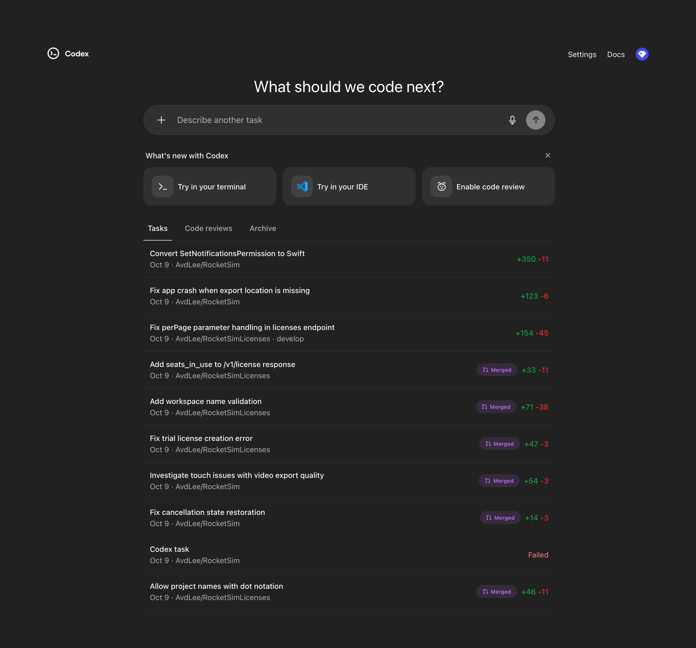 The result is a list of Codex tasks that I triggered within an hour while working from a coffee place. I was impressed! Sure, not everything was worth merging or even continueing, but I still fixed quite a few bugs in a much shorter time.
